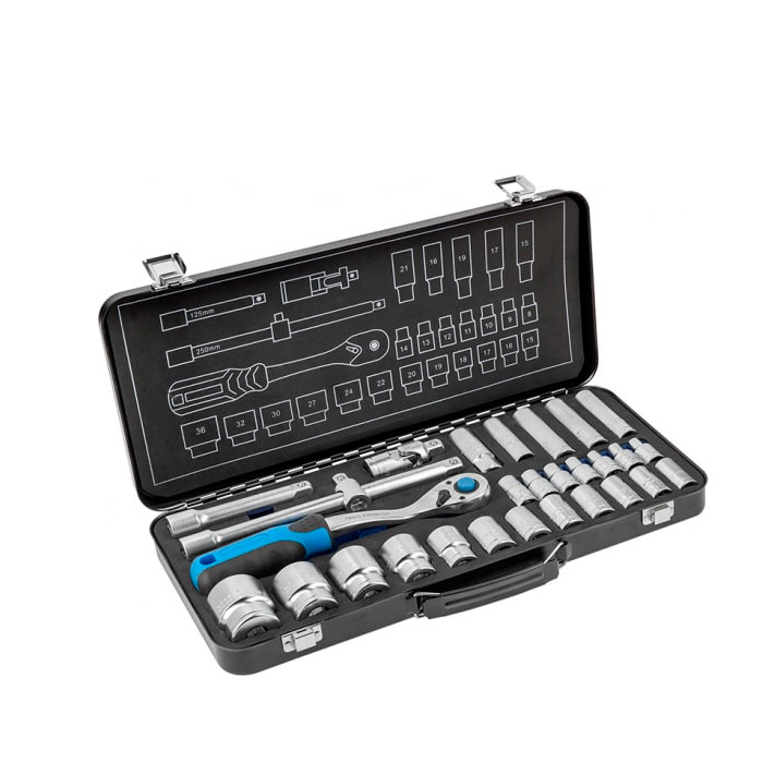 Набор головок и принадлежностей Hoegert HT1R480 29 шт – подойдет для сборочных мастерских, автосервисов, а также для частного использования. Поставляется в прочном пластиковом кейсе с индивидуальными позициями. Биты выполнены из стали S2, которая обладает высокой прочностью и стойкостью к разломам и разрывам. Трещотка оснащена двухкомпонентной накладкой.